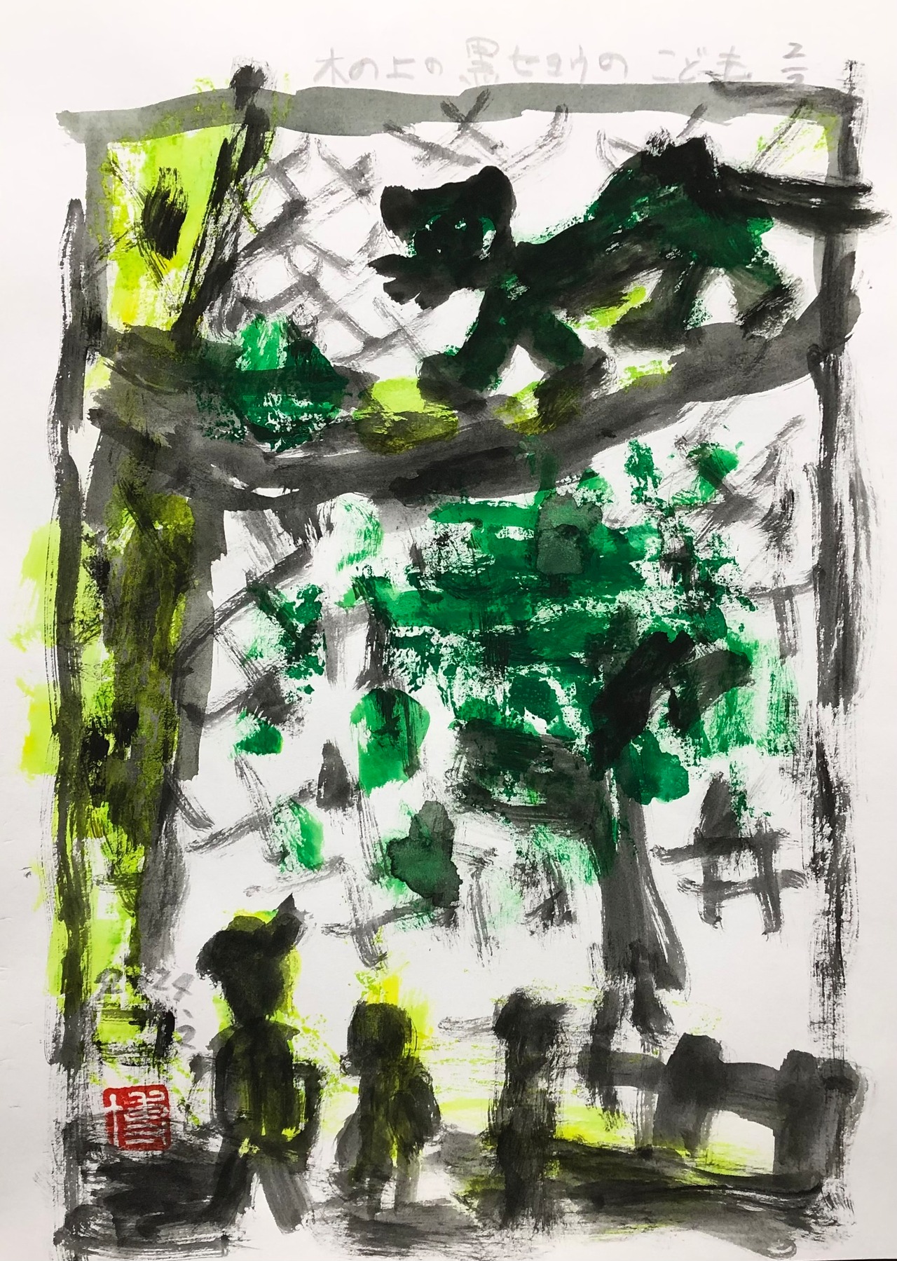 ⑯題名:木の上の黒ヒョウのこどもB(版画)